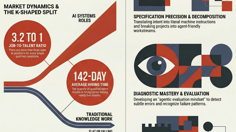 The AI labor market is currently experiencing a dramatic K-shaped split. While traditional knowledge work roles face stagnation or decline, demand for AI-specific talent is functionally infinite, with a ratio of 3.2 jobs for every qualified candidate. Employers are struggling to fill these roles, with an average hiring time of 142 days and salaries reaching up to R600K for those with the right expertise. This disconnect exists because many applicants lack seven specific, learnable skill sets required to build, operate, and manage AI systems effectively. This post breaks down the current market dynamics and details the seven critical skills—from specification precision to token economics—that will allow you to command top dollar in the new AI economy.